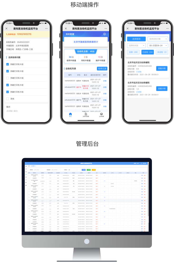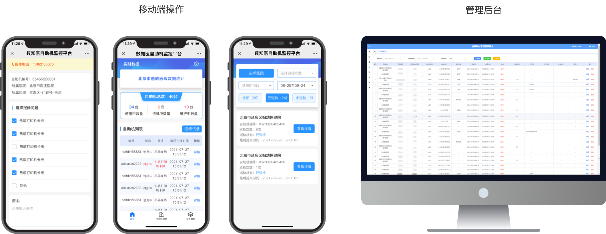 医院日常设备在使用过程中,可能会出现硬件及软件相关问题,包括打印机缺纸、卡纸,程序报错,读卡异常、屏幕显示异常等。为了方便医院、厂商、患者能便捷地处理相关问题,我们针对已上线和即将上线的业务,为院方开发“云运维”服务平台。 平台旨在帮助医院解决众多设备使用过程中的各类问题,及时报修,提高设备使用率,减少沟通成本,降低设备故障恢复时间,同时最重要的是提高患者就医体验。